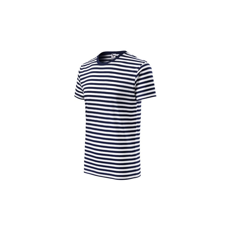 Koszulka wysokiej jakości w paski biało-granatowe. Kołnierzyk z dzianiny ściągaczowej z dodatkiem 5 % elastanu. Taśma wzmacniająca wokół szyi. Ramiona wzmocnione taśmą w kolorze koszulki. Krój z bocznymi szwami. Odpowiednia do nadruku i haftów.